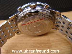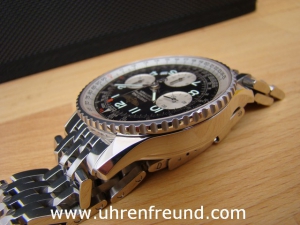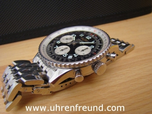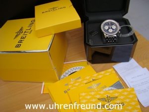 Original Breitling Navitimer Ref. A23322 mit schwarzem Zifferblatt und Stahllünette aus dem Jahr 2005. Verkaufsdatum 24-05-2005. Die Uhr hat einen Durchmesser von 46 mm. An der Uhr befindet sich ein Stahlband. Das Chronograph Automatik Breitling Uhrwerk Kal. 23, ist kontrolliert und läuft einwandfrei. Gehäuse und Band weisen beinah keine Gebrauchsspuren auf. Die Uhr kann als neuwertig bezeichnet werden. Der aktuelle Listenpreis ist 5150,- Euro. Die Lieferung erfolgt mit Originalzertifikat, Chronometerzertifikat, Box mit Umkarton, Beschreibung und Rechnung von Classic Watches.