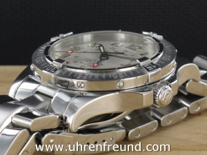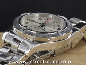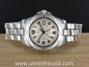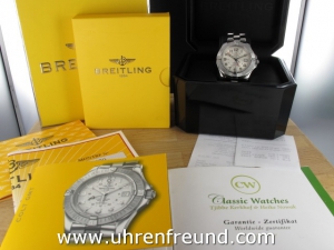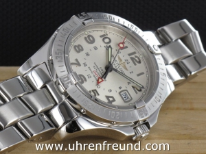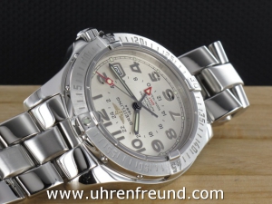 Original Breitling Colt GMT ref. A32350 aus 03-2007 mit silbernem Zifferblatt. Die Uhr hat einen Durchmesser von 40 mm. An der Uhr befindet sich ein massives Fighterband in Stahl. Das Chronometer Automaticwerk Breitling 32, ist kontrolliert und läuft einwandfrei. Gehäuse und Band weisen nahezu keine Gebrauchsspuren auf. Die Lieferung erfolgt mit Originalzertifikat, Chonometer Zertifikat, Anleitung Box mit Umkarton, Beschreibung und Rechnung von Classic Watches und CW-Garantiezertifikat.