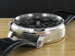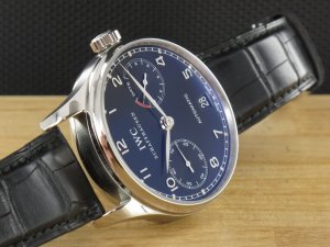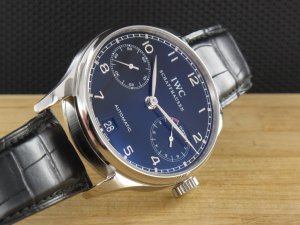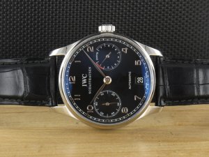 IWC Portugieser Automatik 7 Tage Gangreserve mit schwarzem Zifferblatt Ref. IW500109 aus 2006 mit Verkaufsdatum 22.08.2006. Das Gehäuse hat einen Durchmesser von 42 mm ohne Krone. Das Gehäuse befindet sich in einem sehr guten Zustand und weist nahezu keine Gebrauchsspuren auf. Das Uhrwerk ist überholt, kontrolliert und und läuft einwandfrei. Die Lieferung erfolgt mit Originalzertifikat, Box mit Umkarton und Rechnung von Classic Watches sowie CW Garantiezertifikat.