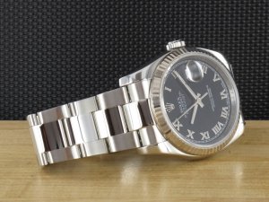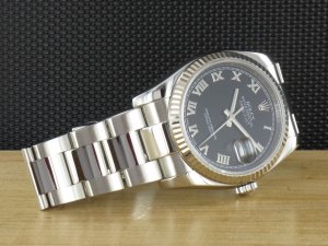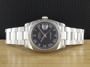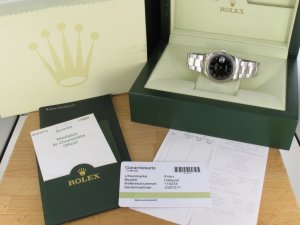Original Rolex Oyster Perpetual Datejust mit geriffelter Weißgoldlünette Ref. 116234 aus dem Jahr 2006 mit Verkaufsdatum 02.07.2007. Das Zifferblatt ist schwarz und die Uhr hat einen Durchmesser von 36mm. Das Gehäuse und Oysterband weisen nahezu keine Gebrauchsspuren auf. Die Uhr kann als neuwertig bezeichnet werden. Das Uhrwerk ist überholt, kontrolliert und läuft einwandfrei. Die Lieferung erfolgt mit Originalzertifikat , Box mit Umkarton und Rechnung von Classic Watches sowie CW Garantie Zertifikat.