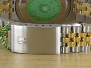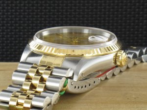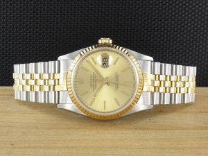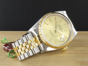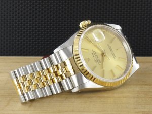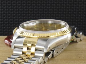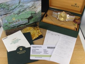 Original Rolex Datejust Ref. 16233 mit Zifferblatt in goldfarben und Gelbgoldlünette aus dem Jahr 1991 mit Verkaufsdatum 20.12.1991. Die Uhr befindet sich im Orginalzustand. Das Gehäuse, Saphirglas und Stahl - Gold - Jubiléband befinden sich in sehr gutem Zustand und weisen keinerlei Gebrauchsspuren auf. Die Uhr könnte als neuwertig bezeichnet werden. Das Automatik Uhrwerk ist überholt, kontrolliert und läuft einwandfrei. Bei der Uhr handelt es sich um die Herrengrösse mit einem Durchmesser von 36 mm, welche auch gerne von Damen getragen wird. Die Lieferung erfolgt mit Box und Umkarton, original Zertifikat, Rechnung von Classic Watches und CW Garantiezertifikat.