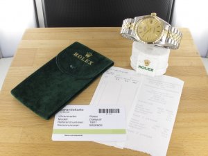 Original Oyster Perpetual Datejust Ref. 1601 mit Zifferblatt in goldfarben und geriffelter Gelbgoldlünette aus dem Jahr 1977. Das Gehäuse, Plexiglas und gefaltete Stahl/Gold Jubiléeband befinden sich in sehr gutem Zustand und weisen beinah keine Gebrauchsspuren auf. Das Automatik Uhrwerk ist überholt, kontrolliert und läuft einwandfrei. Bei der Uhr handelt es sich um das Herrenmodell mit einem Durchmesser von 36 mm, welches auch sehr gerne von Damen getragen wird. Der Rolex Klassiker schlechhin! Die Lieferung erfolgt mit Serviceetui, Rechnung von Classic Watches und CW-Garantiezertifikat.