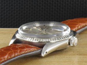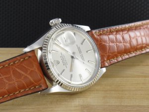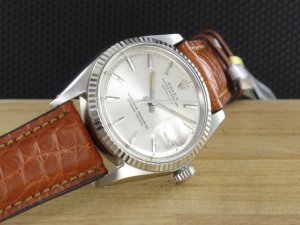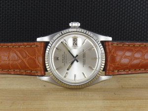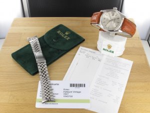 Original Oyster Perpetual Datejust Ref. 1601 mit Zifferblatt in Silber und geriffelter Weißgold Lünette aus dem Jahr III 1967. Das Gehäuse und Plexiglas befinden sich in sehr gutem Zustand und weisen nahezu keine Gebrauchsspuren auf. An der Uhr befindet sich ein braunes Alligator Lederband welches neu und ungetragen ist. Das original gefaltete Jubilèband wird mitgeliefert und kann auch getragen werden. Das Automatik Uhrwerk ist überholt, kontrolliert und läuft einwandfrei. Bei der Uhr handelt es sich um das Herrenmodell mit einem Durchmesser von 36 mm, welches auch sehr gerne von Damen getragen wird. Der Rolex Klassiker schlechthin! Die Lieferung erfolgt mit Serviceetui, Rechnung von Classic Watches und CW-Garantie Zertifikat.