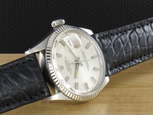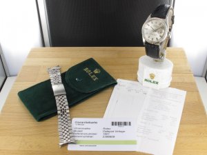 Original Oyster Perpetual Datejust Ref. 1601 mit Zifferblatt in silber und geriffelter Weissgoldlünette aus dem Jahr II 1970. Das Gehäuse und Plexiglas befinden sich in sehr gutem Zustand und weisen nahzu keine Gebrauchsspuren auf. An der Uhr befindet sich ein schwarzes Alligatorlederband welches neu und ungetragen ist. Das original gefaltete Jubilèband wird mitgeliefert und kann auch getragen werden. Das Automatik Uhrwerk ist überholt, kontrolliert und läuft einwandfrei. Bei der Uhr handelt es sich um das Herrenmodell mit einem Durchmesser von 36 mm, welches auch sehr gerne von Damen getragen wird. Der Rolex Klassiker schlechhin! Die Lieferung erfolgt mit Serviceetui, Rechnung von Classic Watches und CW-Garantiezertifikat.