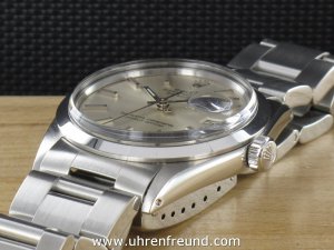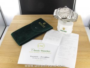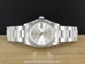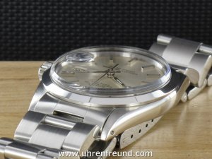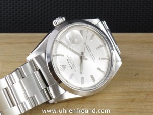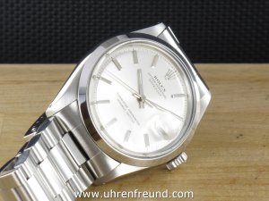 Original Oyster Perpetual Datejust Vintage Ref. 1600 mit Zifferblatt in silber und glatter Edelstahllünette aus dem Jahr 1970. Das Gehäuse, das massive Oysterband und Plexiglas befinden sich in sehr gutem Zustand und weisen beinah keine Gebrauchsspuren auf. Das Automatik Uhrwerk ist überholt, kontrolliert und läuft einwandfrei. Bei der Uhr handelt es sich um das Herrenmodell mit einem Durchmesser von 36 mm, welches auch sehr gerne von Damen getragen wird. Der Rolex Klassiker schlechthin! Die Lieferung erfolgt mit Service Etui, Rechnung von Classic Watches und CW-Garantiezertifikat.