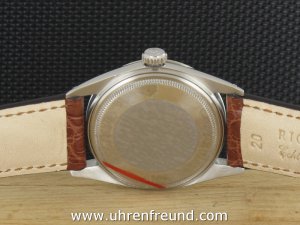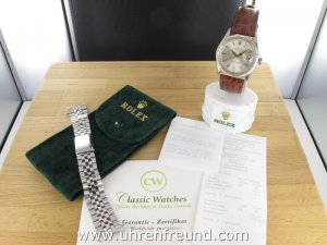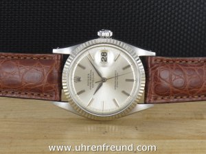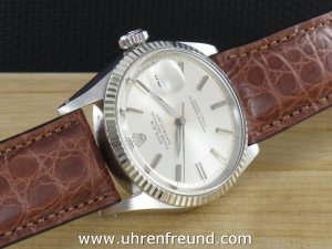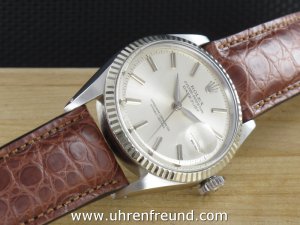 Original Oyster Perpetual Datejust Vintage Ref. 1601 mit Silberfarbenem Zifferblatt und geriffelter Weißgoldlünette aus dem Jahr I 1964. Das Gehäuse und Plexiglas befinden sich in sehr gutem Zustand und weisen beinah keine Gebrauchsspuren auf. Das braune Alligator Lederband ist neu und ungetragen. Das Automatik Uhrwerk ist überholt, kontrolliert und läuft einwandfrei. Das original Jubile Stahlband wird mitgeliefert und kann noch gut an der Uhr getragen werden. Bei der Uhr handelt es sich um das Herrenmodell mit einem Durchmesser von 36 mm, welches auch sehr gerne von Damen getragen wird. Der Rolex Klassiker schlechhin! Die Lieferung erfolgt mit original Jubileband, Service Etui, Rechnung von Classic Watches und CW-Garantiezertifikat.