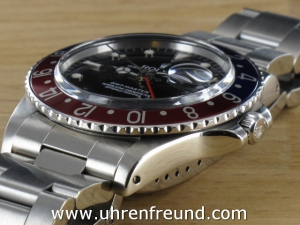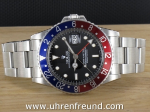 Original Rolex GMT Master Ref. 16750 mit Tritium-Zifferblatt und Zeigersatz, Datumschnellschaltung und Plexiglas aus dem Jahr 1984. Die Lünette ist blau/rot. Das noch sehr volle Gehäuse befindet sich in sehr gutem Zustand und weist nur sehr geringe Gebrauchsspuren auf. Das Uhrwerk ist überholt kontrolliert und läuft einwandfrei! Ein sehr schöner Klassiker!! Die Lieferung erfolgt mit Box und seriennummerbezogener Rechnung von Classic Watches.