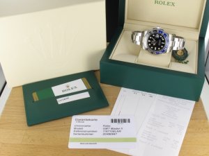 Rolex GMT Master Ref. 116710 BLNR mit schwarzem Zifferblatt und blau schwarzer Keramik Lünette aus 2018 mit Verkaufsdatum 26.03.2018. Das Gehäuse und Band befinden sich in neuwertigem Zustand und weisen keine Gebrauchsspuren auf. Die Uhr kann als neuwertig bezeichnet werden. Das Uhrwerk wurde kontrolliert und läuft einwandfrei. Die Lieferung erfolgt mit Box und Umkarton, Garantiekarte,Rechnung von Classic Watches sowie CW Garantiezertifikat.