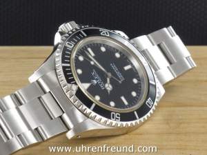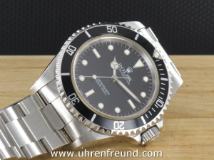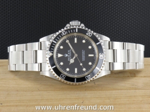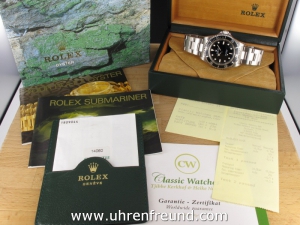 Original Rolex Submariner Ref. 14060 aus dem Jahr 1996. Die Uhr befindet sich im Originalzustand! Das Zifferblatt und die drehbare Taucherlünette sind schwarz. Die Uhr hat einen Durchchmesser von 40 mm. Das Saphierglas, Gehäuse und massive Rolexband mit Flip-Lock-Schliesse und Taucherverlängerung sind in sehr gutem Zustand und weisen nur sehr geringe Gebrauchsspuren auf. Das Uhrwerk ist überholt, kontrolliert und läuft einwandfrei! Die Lieferung erfolgt mit Box, original Papieren, Rechnung von Classic Watches und CW-Garantiezertifikat.