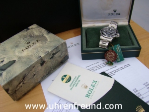 Original Rolex Submariner Date Ref. 1680 aus dem Jahr 1978. Verkaufsdatum 02.05.1980 Die Uhr war in 06-2009 bei Rolex Köln zur Komplettüberholung. Rechnung über 914,- Euro wird mitgeliefert. Nach der Revision wurde die Uhr nicht mehr getragen. Folgende Teile wurden ersetzt: Krone, Tubus, Dichtungen, Plexiglas Zahlenscheibe und Schließe. Das Zifferblatt ist Original geblieben. Die Zeiger sind neu. Das Gehäuse und das Original and ref. 93150 wurden aufgearbeitet. Die Lieferung erfolgt mit Box, Originalzertifikat, Revisionspapieren vom 06-2009 und Rechnung von Classic Watches.
