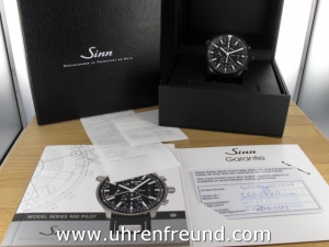 Sinn 900 S Fliegerchronograph 900.020 aus 04-2012. Die Uhr ist getragen aber absolut neuwertig! Zum Lieferumfang gehört die Box mit Umkarton, Bedienungsanleitung und Garantiekarte sowie Rechung von Classic Watches. Die Uhr hat noch bis 04-2015 Werksgarantie von Sinn. Aktueller Listenpreis = 3.255,- Euro