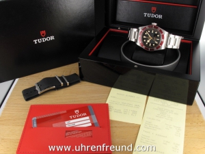 Tudor Heritage Black Bay Ref. 79220R aus 05 - 2013. Die Uhr ist sehr wenig getragen und absolut neuwertig. Die Lieferung erfolgt mit zusätzlichem Stoffband, Originalzertifikat, Box mit Umkarton und Rechnung von Classic Watches. Die Uhr hat noch Garantie von Tudor bis 05 - 2015.