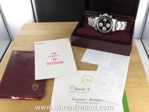 Original Tudor Prince Date Chrono Time Ref. 79260 aus dem Jahr 2001. Die Uhr befindet sich im Originalzustand! Das Zifferblatt ist schwarz und die Totalisatoren sind creme. Die Uhr hat einen Durchmesser von 40 mm, eine feste schwarze Lünette und die Drücker und Krone sind verschraubt. Gehäuse und Stahlband sind in sehr gutem Zustand und weisen nahezu keine Gebrauchsspuren auf. Das Uhrwerk ist überholt, kontrolliert und läuft einwandfrei! Die lieferung erfolgt mit Box, original Papieren, Rechnung von Classic Watches und CW Garantiezertifikat.