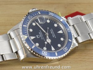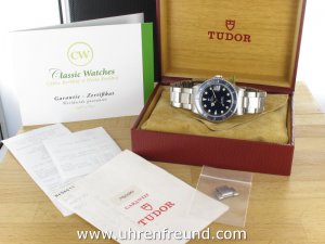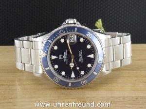 Original Tudor Submariner Ref. 75090 mit Zifferblatt in blau und Saphirglas aus dem Jahr 1992. Der Durchmesser der Uhr ist 36 mm, es handelt sich um das Medium Modell, welches auch gerne von Damen getragen wird. Das Uhrwerk ist überholt, kontrolliert und läuft einwandfrei. Das Rolexgehäuse befindet sich in sehr gutem Zustand und weist nahezu keine Gebrauchsspuren auf. An der Uhr befindet sich ein Tudor-Faltband. Bei dieser Uhr handelt es sich um eine seltene Ausführung, da diese Referenz nur sehr kurz produziert wurde. Die Lieferung erfolgt mit Box, Originalzertifikat, Rechnung von Classic Watches und CW - Garantiezertifikat.